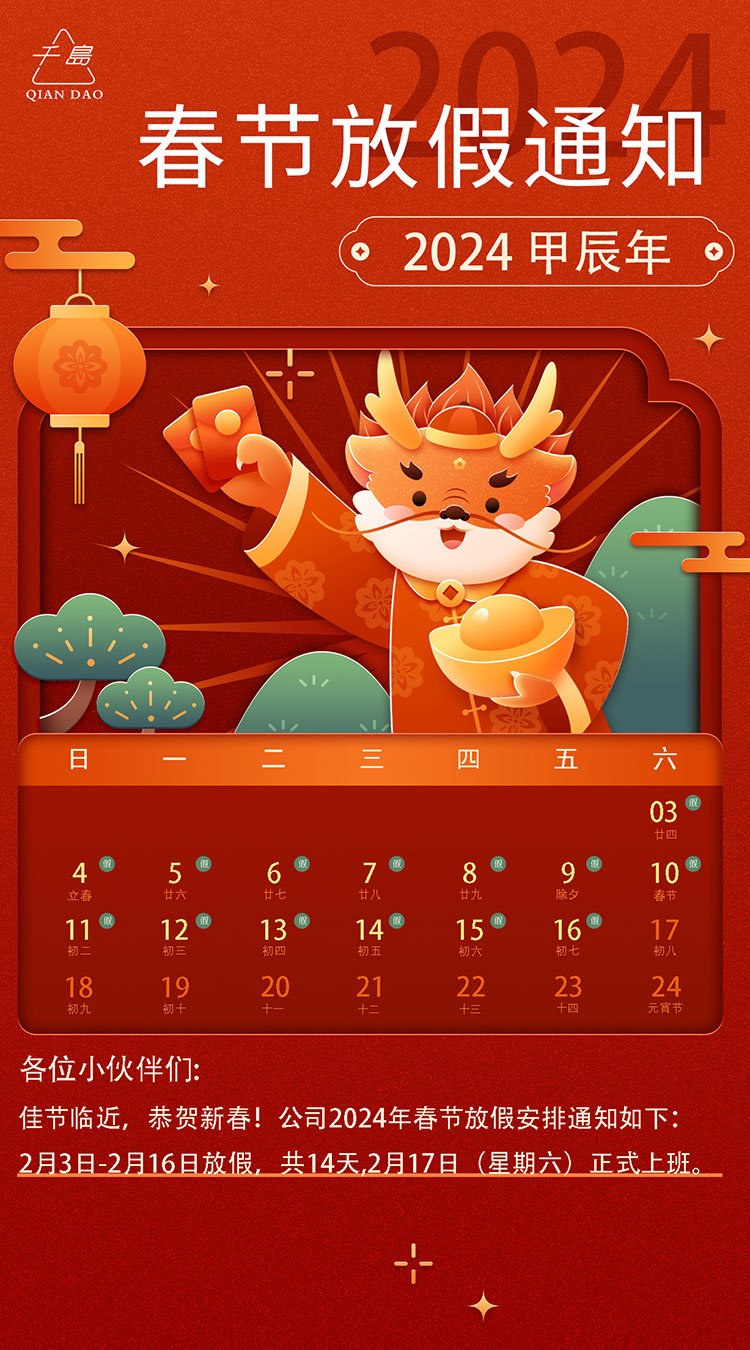 結(jié)合本公司實(shí)際生產(chǎn)需要和國家法定節(jié)假日,千島機(jī)械2024年春節(jié)放假時(shí)間為:2月3日至2月16日,共計(jì)14天,特此通知