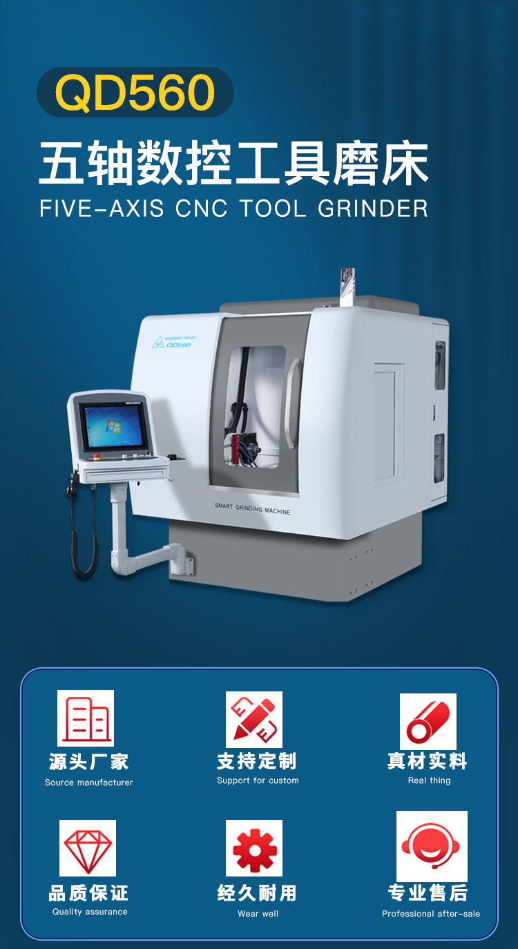 QD560是千島公司新研發(fā)的五軸五聯(lián)動數(shù)控工具磨床,是一款高性價(jià)比刀具磨床,適用于生產(chǎn)或修磨各類銑削類刀具、鉆削類刀具、成形刀具等 。